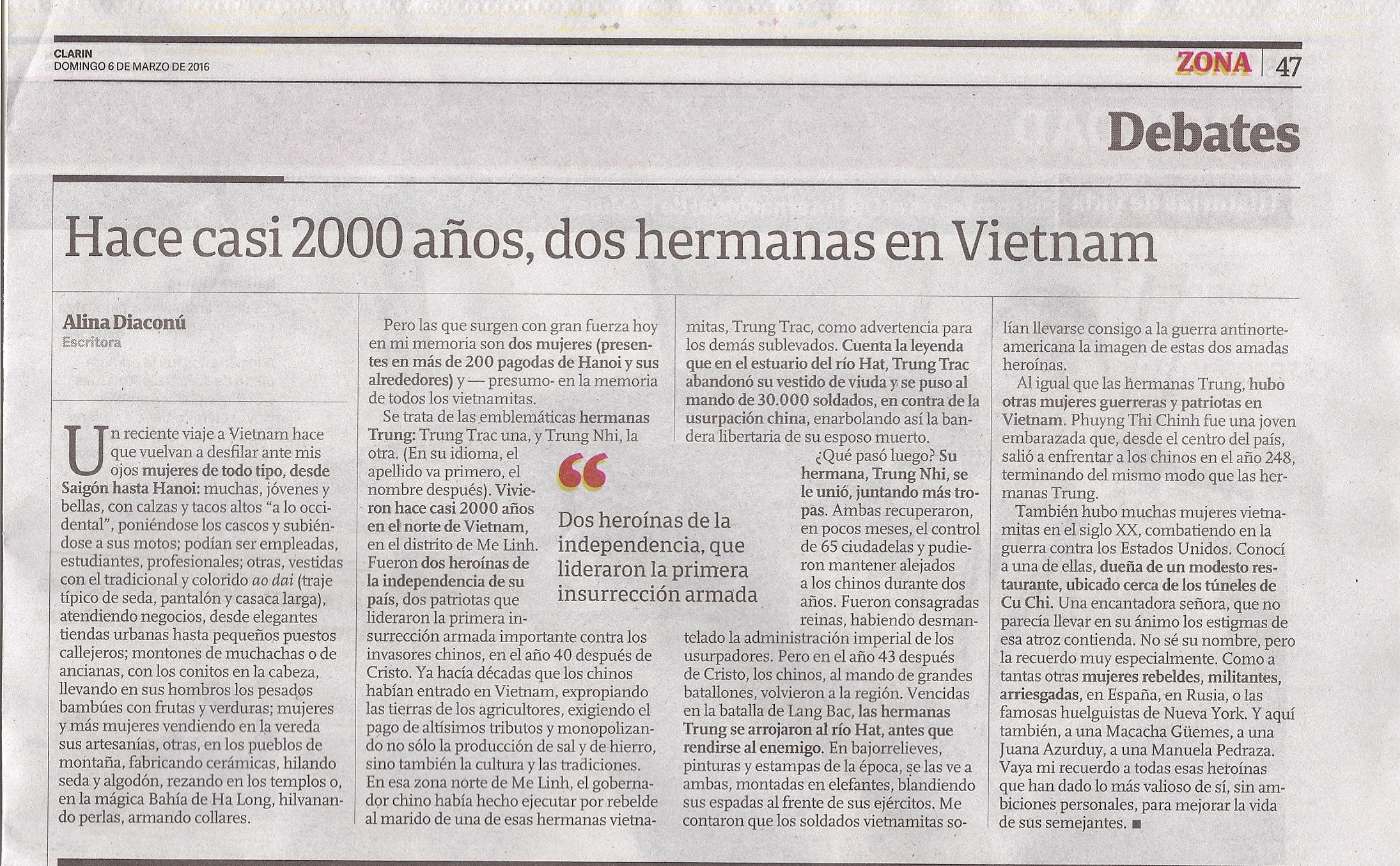 De igual modo saludamos y agradecemos a Mario Muñoz Mendoza, que desde Bolivia transmitió sus felicitaciones al pueblo vietnamita por su causa revolucionaria y de desarrollo nacional, y a las mujeres vietnamitas, en particular a las que trabajan en la Voz de Vietnam. El igual mensaje lo extendió Agide Melloni, de Italia, a todas las mujeres que trabajan y colaboran en los programas de la Voz de Vietnam. Por el mismo motivo David Iurescia, de Argentina nos mandó como archivo adjunto un escaneo de un artículo del diario Clarín donde se habló sobre las hermanas Trung, quienes desde hace 2000 años simbolizan la valentía y la indomabilidad de la mujer vietnamita en la defensa de su Patria. Gracias David.