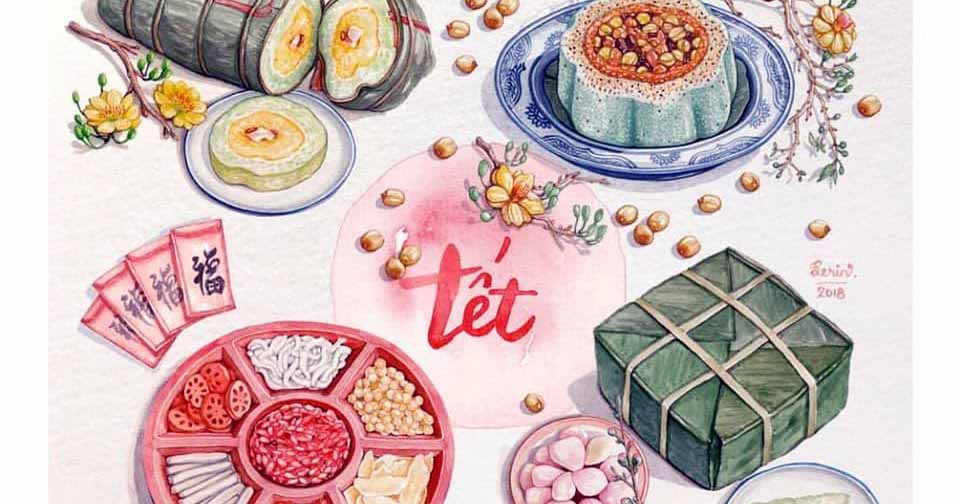 Pasteles de arroz glutinoso, arroz glutinoso cocido a vapor, dulces y frutas confitadas son productos típicos del Tet de Vietnam |
