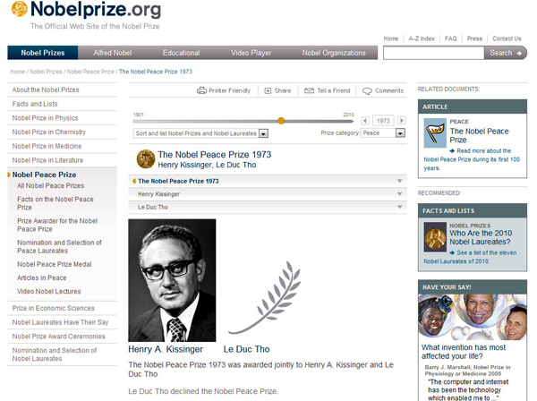 Ese mismo año, el Instituto Nobel concedió a Le Duc Tho y a Henry Kissinger, secretario de estado del Gobierno de EEUU, el Premio Nobel de la Paz por “los esfuerzos en los acuerdos de paz que pusieron fin a la Guerra de Vietnam.” No obstante, sólo Kissinger recogió el galardón, mientras el diplomático vietnamita lo rechazó argumentando que su país todavía no había alcanzado la paz y que lo que hizo fue simplemente por el bien de su pueblo.