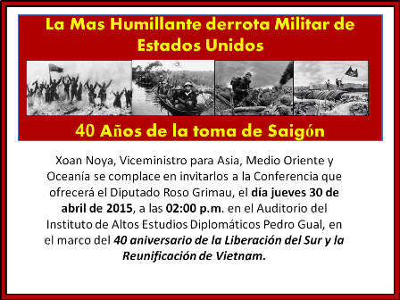 Celebramos en los últimos días el cuadragésimo aniversario de la liberación del Sur y la reunificación de Vietnam, el 30 de abril de 1975, fecha que entró en la historia de nuestro país como un capítulo de oro. Se han efectuado en esta ocasión, además de actos de homenaje a los mártires y héroes nacionales, conferencias, seminarios, encuentros, exposiciones y programas de intercambio artístico. Se reportan actividades conmemorativas en varios países para rememorar este acontecimiento histórico, como en Rusia, Ucrania, Egipto, Argentina, Cuba y Venezuela.