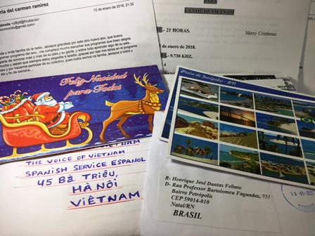 Si cada día me llegan tantos mensajes enviados desde la lejanía como ahora, no sentiré nada frío. ¿Cómo están, queridos amigos? Me alegra charlar con ustedes mediante las cartas y los emails que recibimos con frecuencia. Saludamos al oyente argentino, Juan Carlos Buscaglia, quien nos compartió: “Estamos sufriendo un verano sumamente tórrido. El termómetro marcó 42 grados. No obstante, esto no ha sido óbice para que haya dedicado tiempo a escuchar su amena programación, dado que, precisamente la noche invita a sentarme en el jardín y escuchar la radio. Sus programas siguen siendo de mi predilección desde la música, la historia, la cultura, las festividades y las costumbres.” Estamos muy agradecidos a todos los oyentes que pese a encontrarse en condiciones climáticas adversas hacen esfuerzos para escucharnos. En este espacio de tiempo limitado, podemos explicarles que cada semana nuestros colaboradores y radioescuchas de los diferentes países en los que se transmiten las ondas de la Radio la Voz de Vietnam nos remitimos informes de recepción. Esta semana, además de postales y mensajes de felicitaciones en ocasión del nuevo año, muchos datos de sintonía nos llegaron desde Radio Habana Cuba, Rafael Reyes Plaza, María del Carmen Ramírez Benítez y María Esther Gómez en Cuba, Luis Camarillo en Estados Unidos, Juan Franco Crespo en España, Andrea Tucci en Italia, Jorge Plaza Gatica en Chile, Alfonso Flores Oliveira en Perú, José Díaz en Puerto Rico y Jorge Ramírez en Guatemala. Les agradecemos por informarnos sobre la calidad de nuestra radiodifusión para que podamos hacer aportes oportunos.
