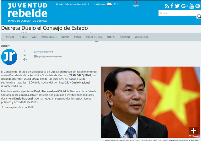 Especialmente, quisiéramos expresar nuestro sincero agradecimiento al pueblo cubano por decretar el Duelo Oficial con motivo del fallecimiento de nuestro presidente Tran Dai Quang, este viernes 21 de septiembre. Hemos recibido recientemente las condolencias de uno de nuestros amigos fieles de la isla, el periodista José Llamos Camejo quien manifestó: “Con mucho pesar he recibido la noticia del repentino deceso del presidente vietnamita Tran Dai Quang, hijo ilustre de su pueblo heroico e incondicional amigo de Cuba. Siento la pérdida como propia. En esta hora de dolor, estamos una vez más junto a nuestros hermanos y hermanas vietnamitas. Al conocer el doloroso suceso acudió a mi mente la imagen de Tran Dai Quang el 15 de noviembre del 2016, en su encuentro con el Comandante en Jefe Fidel. Fue el último mandatario extranjero que se entrevistó con nuestro líder histórico, apenas 10 días antes de su muerte, y ese hecho tiene una fuerte carga simbólica. Creo que en esa ocasión la casualidad fue justa y consecuente con la historia hermosa de solidaridad que ambas naciones han cultivado. Deseo reiterar al colectivo de la VOV, a los periodistas y al pueblo de Vietnam, mi más sentido pésame ante la pérdida tan sensible. Tengo la seguridad de que, como siempre, ustedes superarán esta hora difícil y saldrán adelante. Y en ese empeño, una vez más podrán contar con nosotros.”