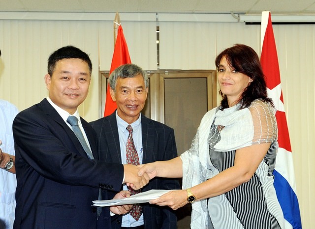 La directora general de la Oficina de Gestión de la Zona Especial de Desarrollo Mariel, Ana Teresa Igarza, entrega al representante de la compañía vietnamita Viglacera en Cuba, Tran Anh Tuan, el Certificado de Registro Comercial de la empresa ViMariel S.A. (Foto: viglacera.com.vn) |