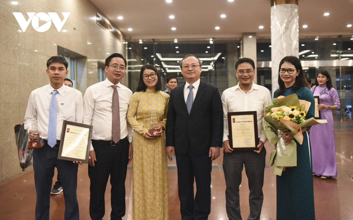 El director general de la Voz de Vietnam, Do Tien Sy y otros líderes de la radio se toman una foto con los autores premiados de la emisora. |