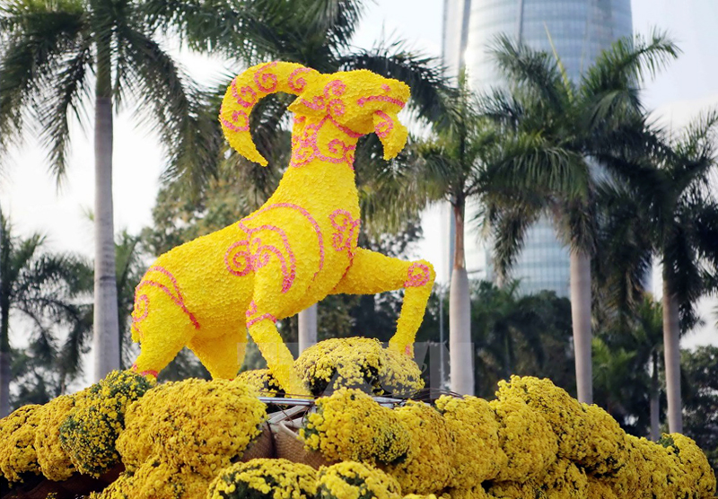 Cabra elaborada con flores de melocotonero y ochna amarilla en la calle