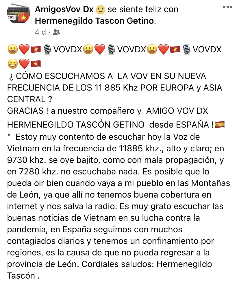 Diego, nos sentimos muy orgullosos y agradecidos. Además de ser una emisora con la misión de difundir la imagen del país y la gente de Vietnam, la VOV también desea convertirse en un compañero, amigo y puente para más oyentes en todo el mundo. Por lo tanto, esperamos que, a través de nuestro programa, pueda conectarse con otras personas que comparten el amor por la radio. También puede seguir la página de Facebook AmigosVov Dx para mantenerse al día con nuestras últimas noticias, así como intercambiar con otros radioescuchas en muchas partes del mundo.