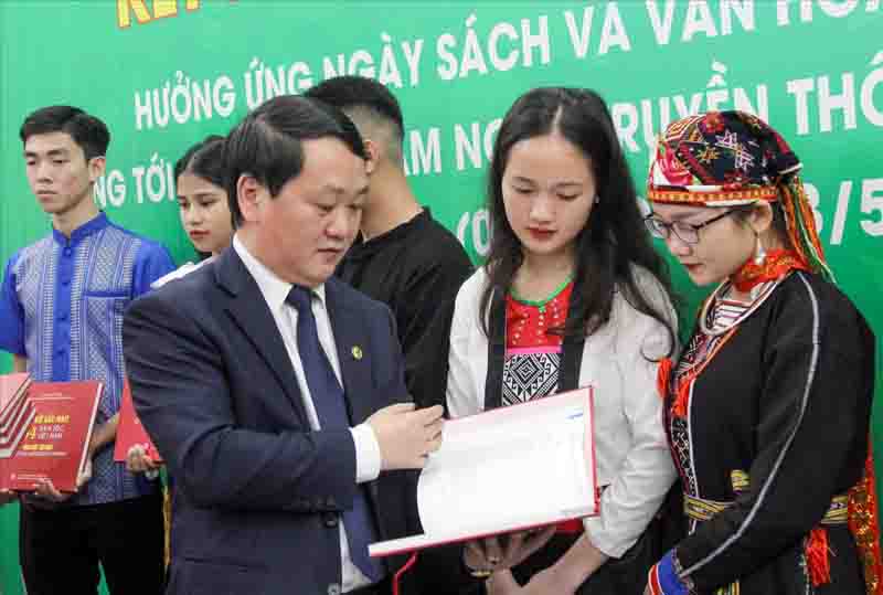 El ministro y presidente de la Comisión de Asuntos Étnicos Hau A Lenh y estudiantes de la Academia de Minorías Étnicas en la Feria del Libro celebrada el 20 de abril en Hanói. (Foto: baodantoc.vn) |