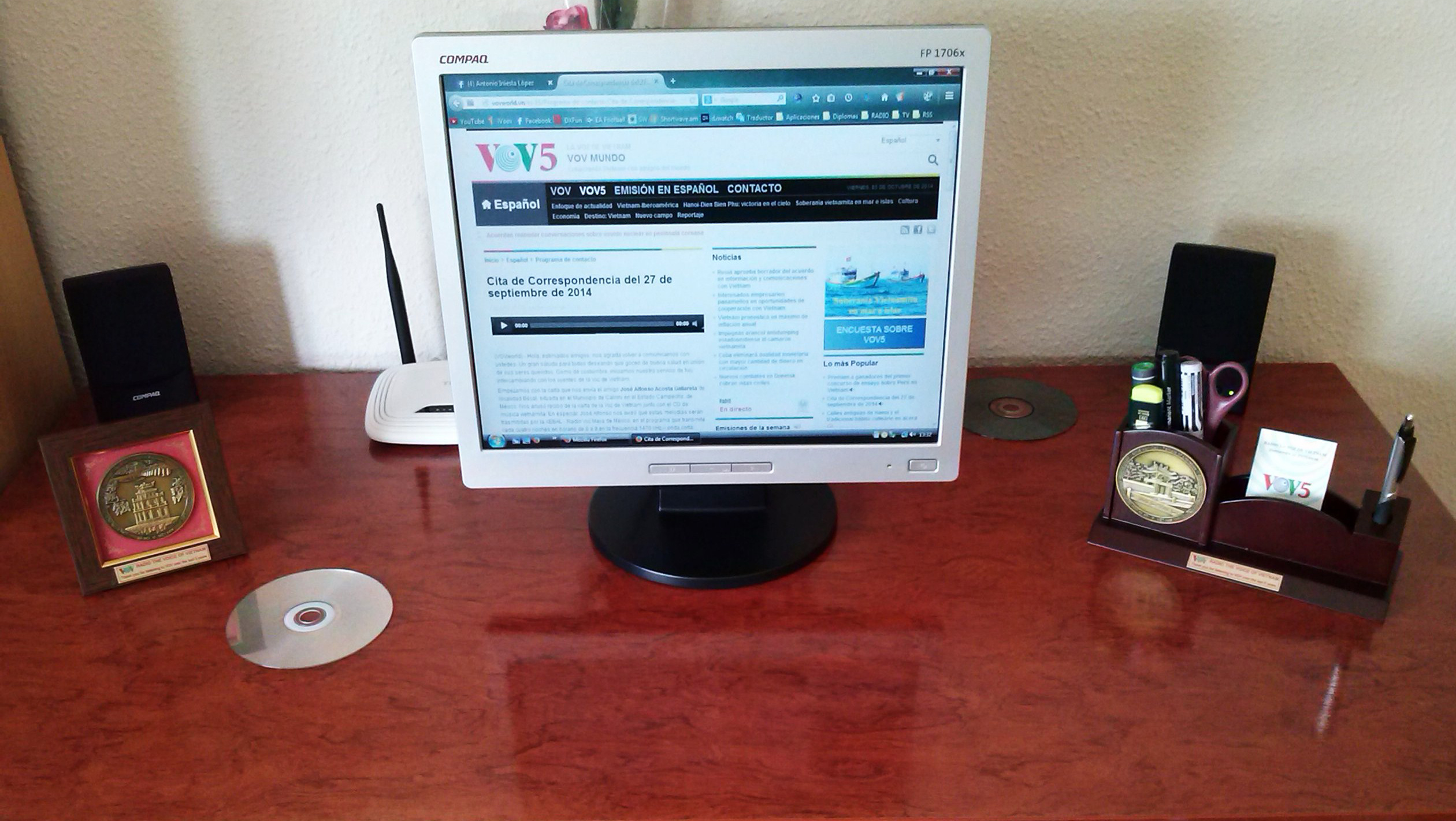 Obsequios de la Voz de Vietnam a Antonio Iniesta López por sus 3 y 5 años de escucha asidua, expuestos en su mesa de trabajo