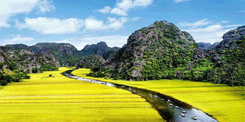 En los botes que navegan por el río Ngo Dong en un ambiente tranquilo, los excursionistas sosiegan el alma entre el verdor de los arrozales acuáticos a lo largo de ambas orillas y la pureza de un espacio sin el ruido de vehículos motorizados y otros sonidos inarticulados de las calles bulliciosas salvo el susurro de los remos y la brisa, el canto de los pájaros y el murmullo del agua que gotea continuamente con el transcurso del tiempo en los inmensos montes kársticos. Cuando entran a las cuevas, los visitantes sentirán la frescura y se sorprenderán al ver las estalactitas que relucen como bloques de joya espléndidos.