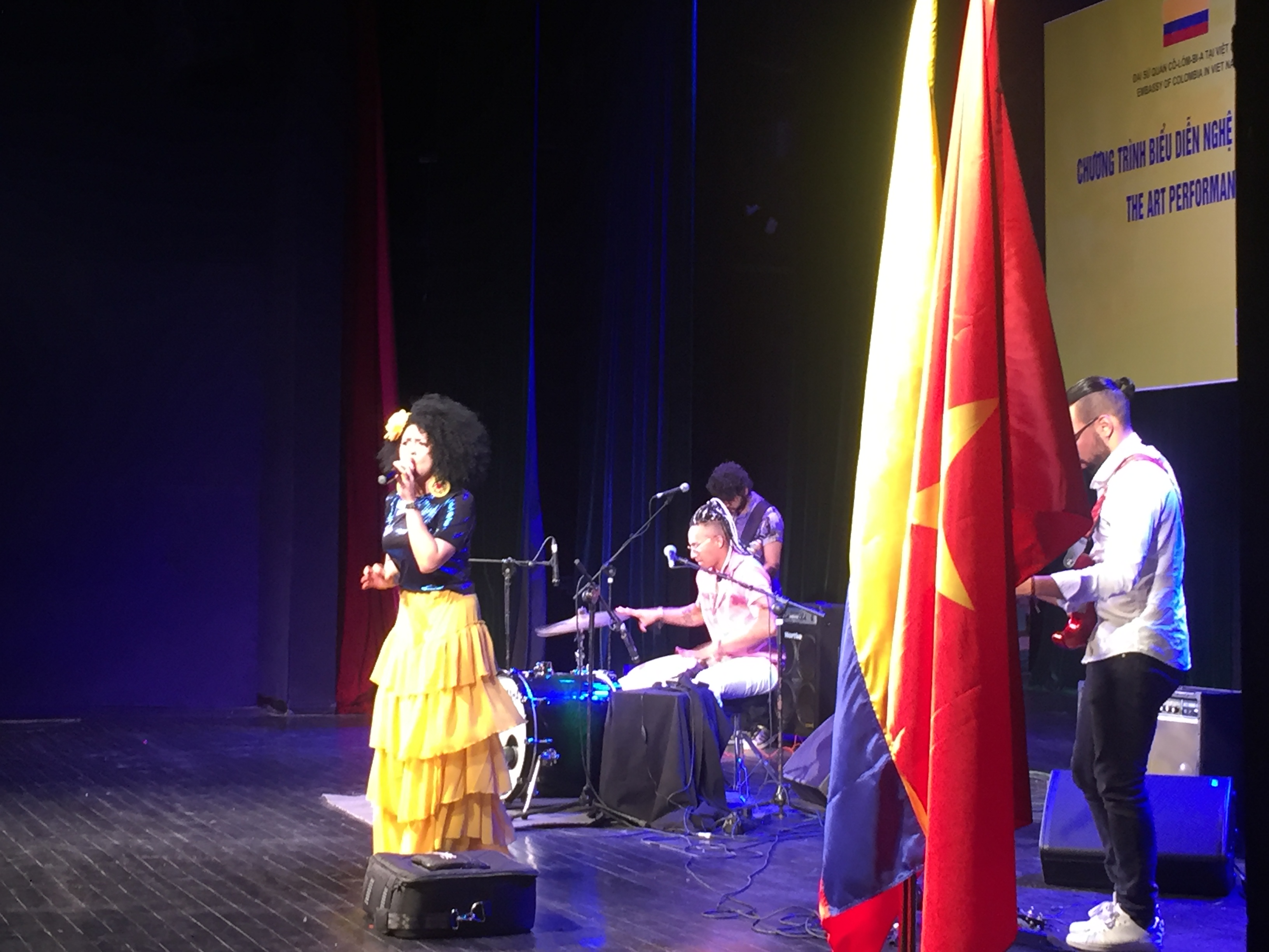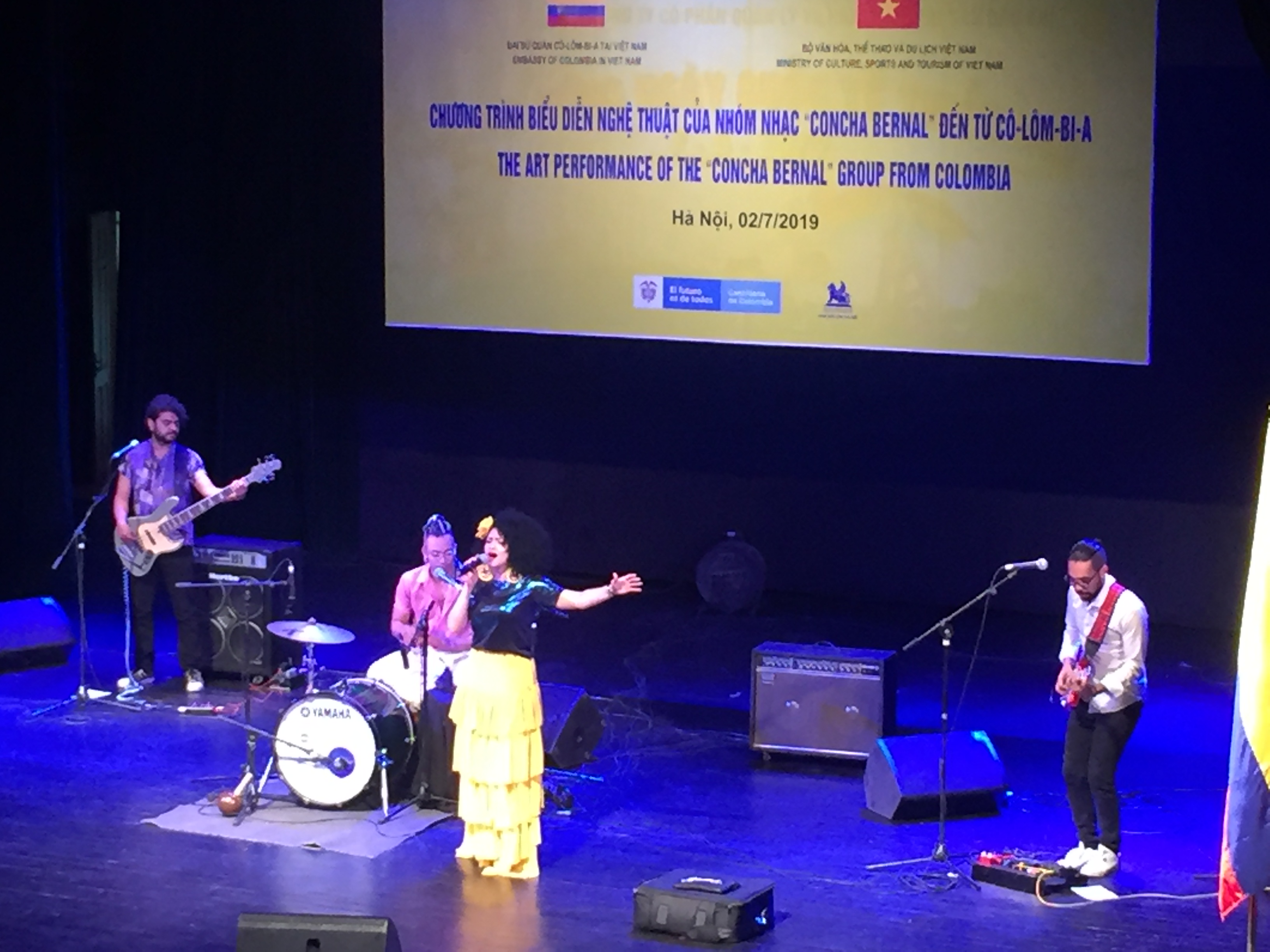 Los emocionantes sonidos que están escuchando son parte de una actuación musical de 2 horas de la artista colombiana Concha Bernal y su banda que tuvo lugar la noche del 2 de julio en el Teatro Tuoi Tre (Juventud), Hanói. La presentación formó parte de una serie de eventos conmemorativos del 40 aniversario del establecimiento de las relaciones diplomáticas entre Vietnam y Colombia.