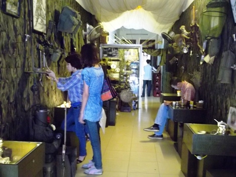 Se exponen en la cafetería "Lính" utensilios, relojes, cuchillos, libros, etc...