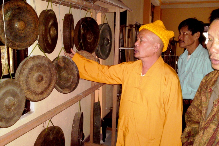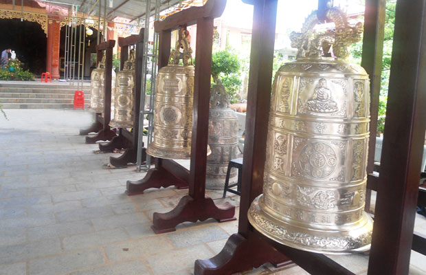 Después de pasar una puerta de madera de caoba con dos techos, los visitantes verán de inmediato una serie de campanas de color amarillo brillante, cada una de ellas con más de 1,3 metros de altura y 0,7 de diámetro, colgadas en marcos de madera. El venerable Thich Vien Thanh se encuentra sentado en una mesa redonda instalada en el patio bebiendo a sorbos una taza de té. Dijo que las campanas están hechas de capas de hierro fundido de bombas y balas remantes de la guerra, que se transfirieron de las provincias de Quang Tri, Quang Nam, Quang Ngai y Lam Dong. Agregó que en 1980 comenzó la restauración del referido lugar con el deseo de convertirlo en un destino de turismo espiritual para los seguidores budistas y visitantes que llegan a Da Lat.