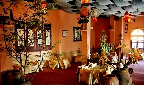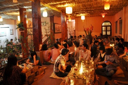 Es un edificio de dos plantas, y cada una de ellas se divide en dos niveles, donde se ponen pequeñas mesas para los comensales, de color y material en armonía con el entorno. La luz suave de los faroles deja apreciar delicadas obras de caligrafía, en cortinas de bambú, y pinturas tradicionales colgadas en las paredes. Las melodías suaves que se difunden en el lugar completan ese entorno acogedor y relajante. Nguyen Huu Thai, un empleado de banco que suele citar a sus amigos aquí dijo: “Frecuento este lugar por su vasto espacio y su música relajante que me serena. Rosas y velas también inspiran romanticismo y agradan a las parejas.”