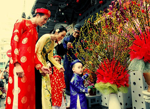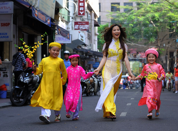Una familia recorre las calles en ocasión del Tet
