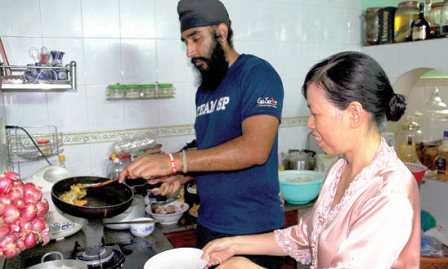 ![]() La señora Dao Kim Hang enseña a Gunjan Singh, un jóven singapurense de 26 años la forma de cocinar platos típicos de los lugareños