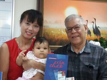 El periodista Angel Bastidas, al lado de su nieta, en brazos de la directora general del Departamento de las Américas de la Asociación de Amistad Vietnam-Venezuela, Nguyen Thi Thu Giang, y el libro "Xin Chao" |