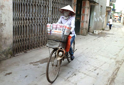 Los anuncios de Thuy cada mañana, a las 5 y media en verano y a las 6 en invierno ya son familiares para los habitantes en las calles y callejuelas del distrito de Hai Ba Trung, en Hanoi. Con el sombrero cónico en la cabeza, el tapabocas y una cesta llena de alimentos ella va en su vieja bicicleta “Thong Nhat” a todos los rincones del distrito capitalino para vender. Generalmente se levanta a las 3 de la madrugada para preparar las tortas de arroz. “Realizo este oficio desde hace 6 o 7 años con un ingreso modesto de 1,5 a 2 millones de dong al mes. Este es un trabajo duro, porque debo preparar los pasteles hasta tarde en la noche y levantarme temprano, sobre todo en el invierno. Por la mañana, cocino y vendo las tortas y después preparo materias primas y envuelvo pasteles. Sin embargo, me he acostumbrado al oficio y no descanso ni un día excepto cuando me enfermo.”