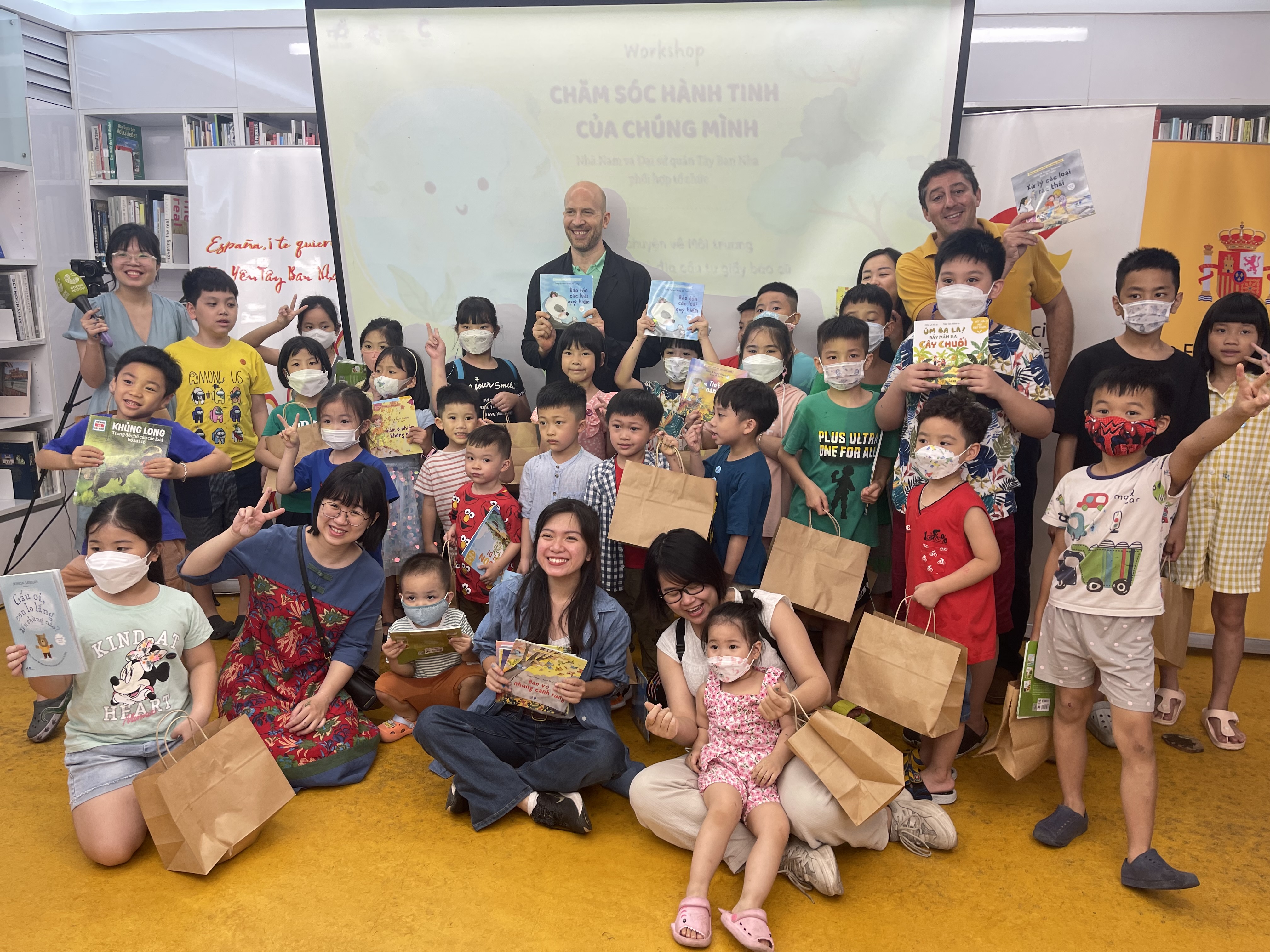 Los niños participantes de la presentación de libros y taller “Cuidemos el planeta” en el Instituto Goethe, en Hanói, junto a sus padres, y representantes de la Embajada de España en Vietnam, la empresa Nha Nam y la organización Wildact. |