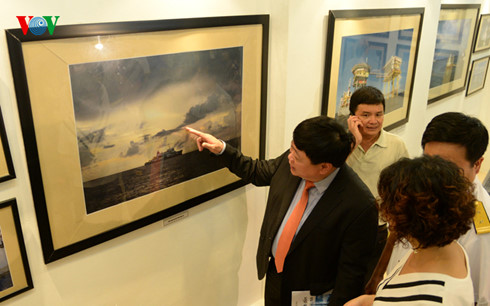 ![]() La periodista Nguyen My Tra introduce sus obras al director general de la Voz de Vietnam, Nguyen The Ky y otros visitantes presentes en su exposición