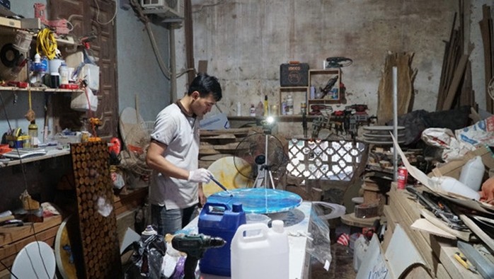 El joven usa una máquina para alisar la superficie de una mesa de té hecha de productos reciclados combinados con la tecnología de resina. A su alrededor, hay embriones de madera y frascos químicos. Con una forma muy profesional de trabajar, nadie pensó que Tuan, con solo dos años de experiencia en el campo del reciclaje, pudiera desarrollar tan eficientemente esta labor, cuya idea se originó a partir de un videoclip sobre el uso de la tecnología de resina epoxi para fabricar muebles que veía casualmente en Internet.“Nací en una aldea donde la mayoría de los pobladores nos dedicamos al oficio de la carpintería, y me sentía mal porque las maderas defectuosas y los troncos huecos solo eran usados como leñas. Los videoclips sobre el reciclaje con la resina líquida que observé en Youtube, me parecieron interesantes y me sugirieron aprovecharla para reciclar las maderas y transformarlas en muebles. En 2018, decidí desarrollar este modelo con el deseo de transmitir el mensaje de que podamos aprovechar los materiales desechables para convertirlos en productos útiles, e incluso abrir negocios para venderlos”.