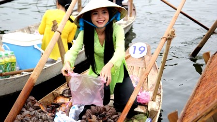 Los turistas participantes en la compraventa viajarán en los barcos para recorrer el mercado flotante y adquirir los manjares sureños. Si les interesa “đờn ca tài tử”, pueden sentarse en una esterilla para compartir melodías folclóricas con artistas de la tierra meridional. El remero Nguyen Hoang Hai del distrito Cai Rang, provincia de Can Tho compartió: “Me siento muy feliz al participar en este programa porque esta es una oportunidad para divulgar los rasgos culturales de mi tierra natal en la parte norteña del país. Acompaño a los turistas a visitar el mercado flotante para que profundicen sus conocimientos sobre las costumbres de compraventa de Cochinchina”.