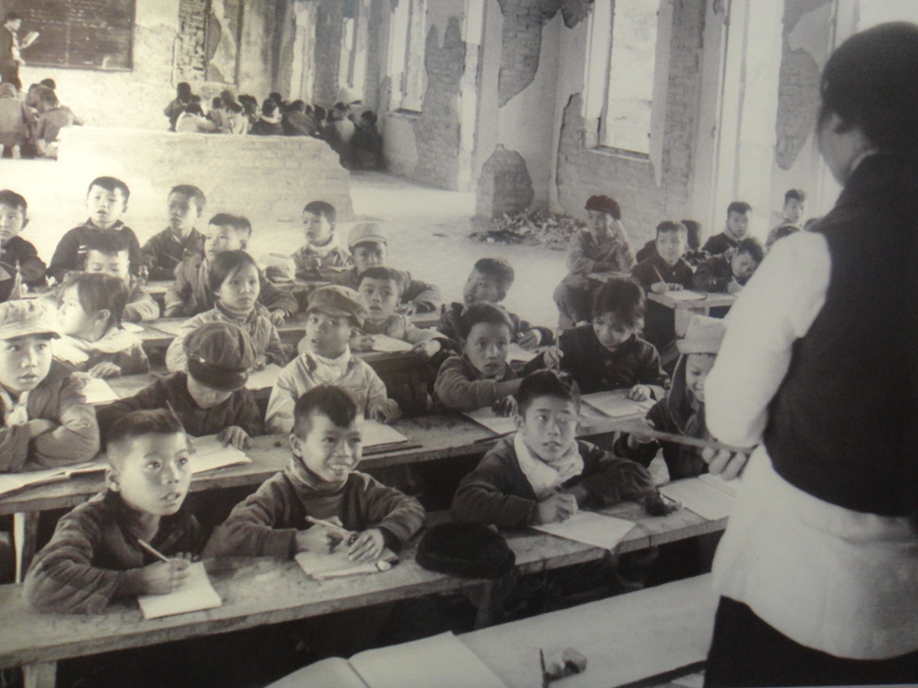 La foto más grande exhibida en la sala principal, trata sobre dos alumnas preparándose para ir a la clase. Parecían no saber o preocuparse para nada de las lluvias de balas y bombas que les acechaban afuera. Sus pertenencias, además de libros, libretas y lápices, incluían un boquintín personal y un sombrero hecho de pajas. Sus escuelas, del nivel preescolar, primario o secundario, se encontraban bajo tierra, en sólidas fortificaciones. Aprendían la forma de curarse una herida, cocinar y cuidar a los más pequeños y débiles…