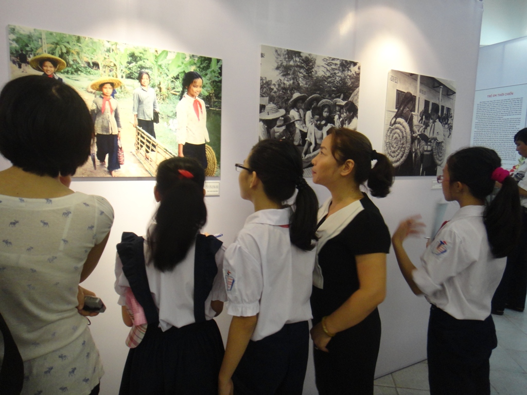 El señor Nguyen Cong Hung está contando a su pequeño hijo sobre las dificultades y penalidades de los niños, reflejadas muy bien en las fotos. El muchacho, de 8 años de edad contempla atento las instantáneas que reportan a niños estudiando o caminando a la escuela con su madre. Al mirarlo, Hung espera que su hijo comprenda algo de la lucha de sus antepasados y se esfuerce más en la vida. Él mismo se siente conmovido al observar las imágenes expuestas aquí. Las fotos que tratan del empeño de los menores en superar las dificultades para ir a la clase son las que más le impresionan. Alumnos descalzos, con sombreros de paja para protegerse, participaban en una ceremonia de inicio del nuevo año escolar al lado de un cráter causado por la explosión de una bomba, pero sin que faltara el ambiente solemne del primer día del nuevo curso, con flores, banderas nacionales y un retrato del Presidente Ho Chi Minh. Bajo fuegos y humos, brillaban rostros inocentes y sonrientes de los niños, en los refugios. La foto que capta a dos chicos sentados en la puerta de un reducto no da la sensación de guerra. Nguyen Cong Hung compartió: “Por casualidad sé de esta exposición. Traigo a mi hijo a ver esta muestra para enseñarle lo que pasaron sus padres y animarle a esforzarse más en los estudios y en la vida. Los niños en las fotos, se enfrascaban en la lectura y los ejercicios, aun sin muchas condiciones apropiadas. Son imágenes muy naturales sobre los alumnos que aspiraban a superarse en plena guerra.”