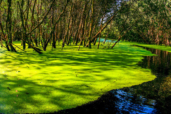 Cuando las embarcaciones motorizadas y botes de madera pequeños, medios de transporte principal en el delta del río Mekong, sobre todo en el tiempo de crecidas, se acercan al bosque de cayeputi de unas 850 hectáreas de extensión, los viajeros pueden ver pájaros audaces que se posan en los árboles, ninfeas y jacintos de agua y captar instantes maravillosos de la naturaleza.