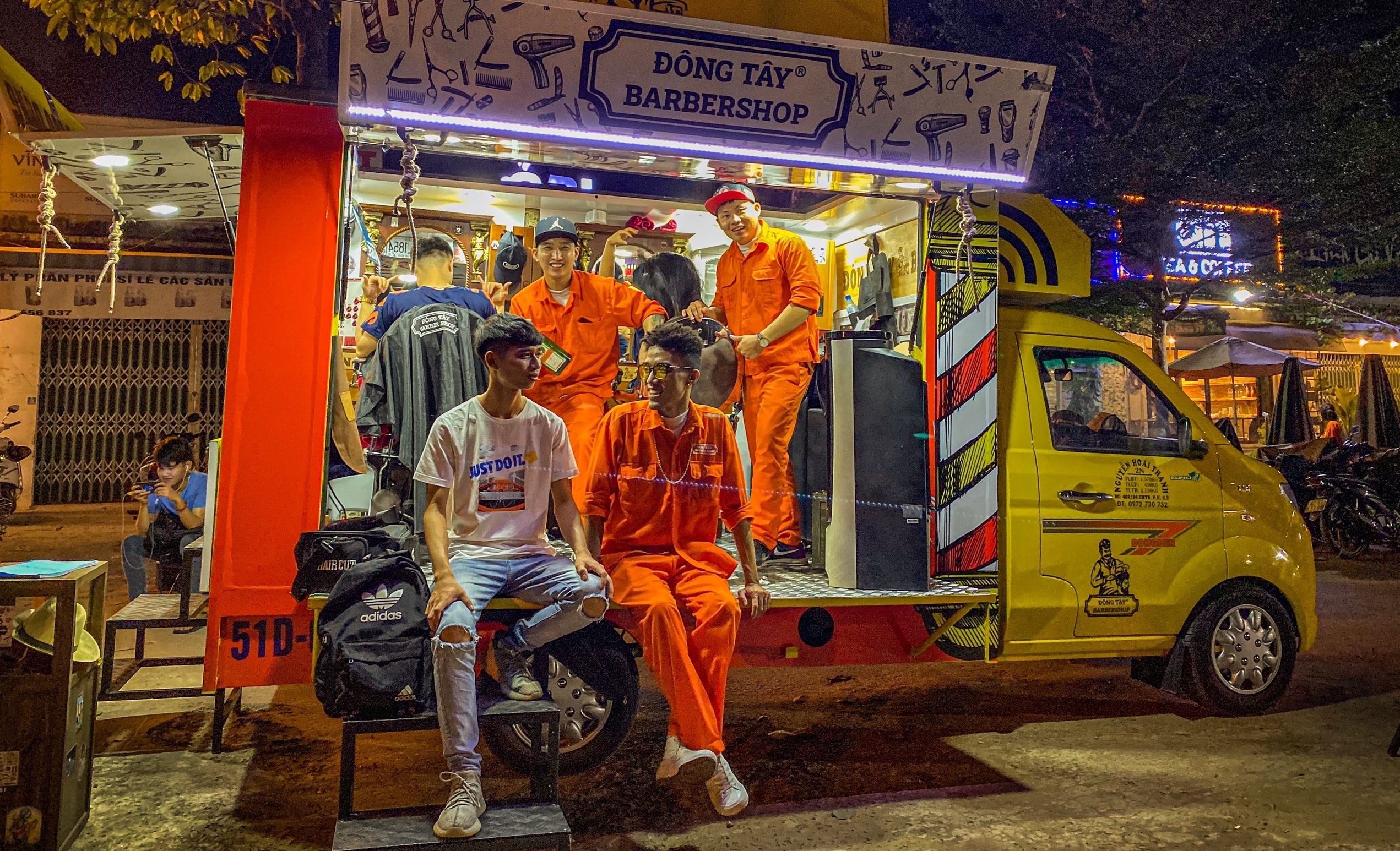 En un pequeño camión bien diseñado, dos jóvenes peluqueros muy profesionales con un uniforme naranja, cortan cuidadosamente el cabello de un chico y una chica. Este “salón de belleza” especial también está pintado en un llamativo color naranja, estacionado justo al lado de la Universidad Tecnológica de Ciudad Ho Chi Minh. La peluquería tiene un espacio reducido, justo para dos sillas, dos mesas con espejos y algunas herramientas necesarias, pero debido al diseño abierto y elegante, los clientes se sienten cómodos. Afuera, justo al lado de un letrero de madera que dice “Peluquería del estudiante 2k – Dong Tay Barbershop”, algunos jóvenes esperan su turno en la fila.