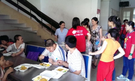 ![]() Los voluntarios de "Hanoi suficiente" reparten raciones de comida a los huérfanos en la Aldea de la Paz, en Hanoi