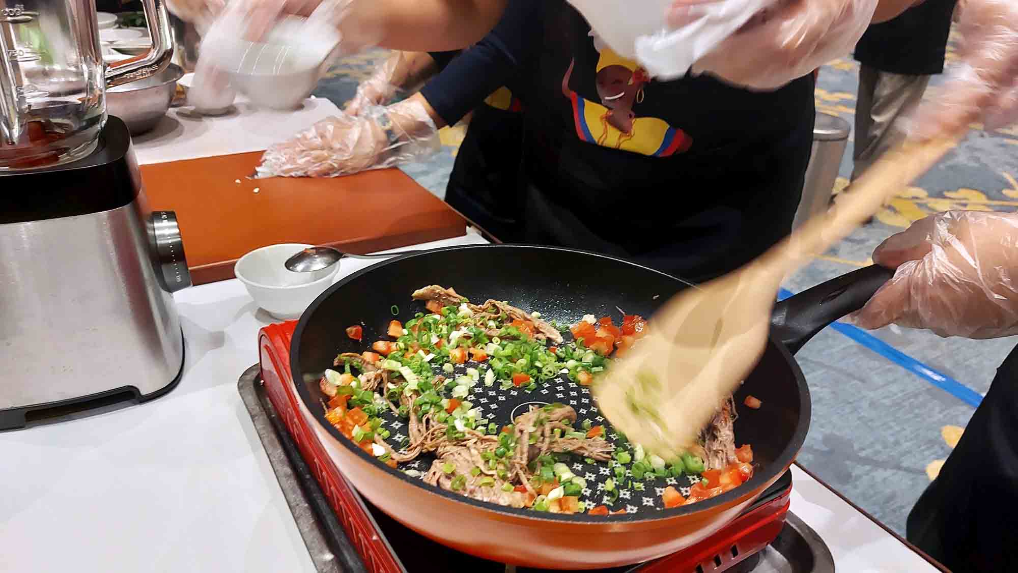 Después de recibir las instrucciones generales, los practicantes mezclaron diligentemente la carne, las cebolletas, los tomates y el comino en polvo para el relleno, y luego los pusieron en una sartén para rehogarlos. Una vez finalizado, todos estaban listos para comenzar el segundo proceso, extender la masa con un rodillo hasta formar una tira.