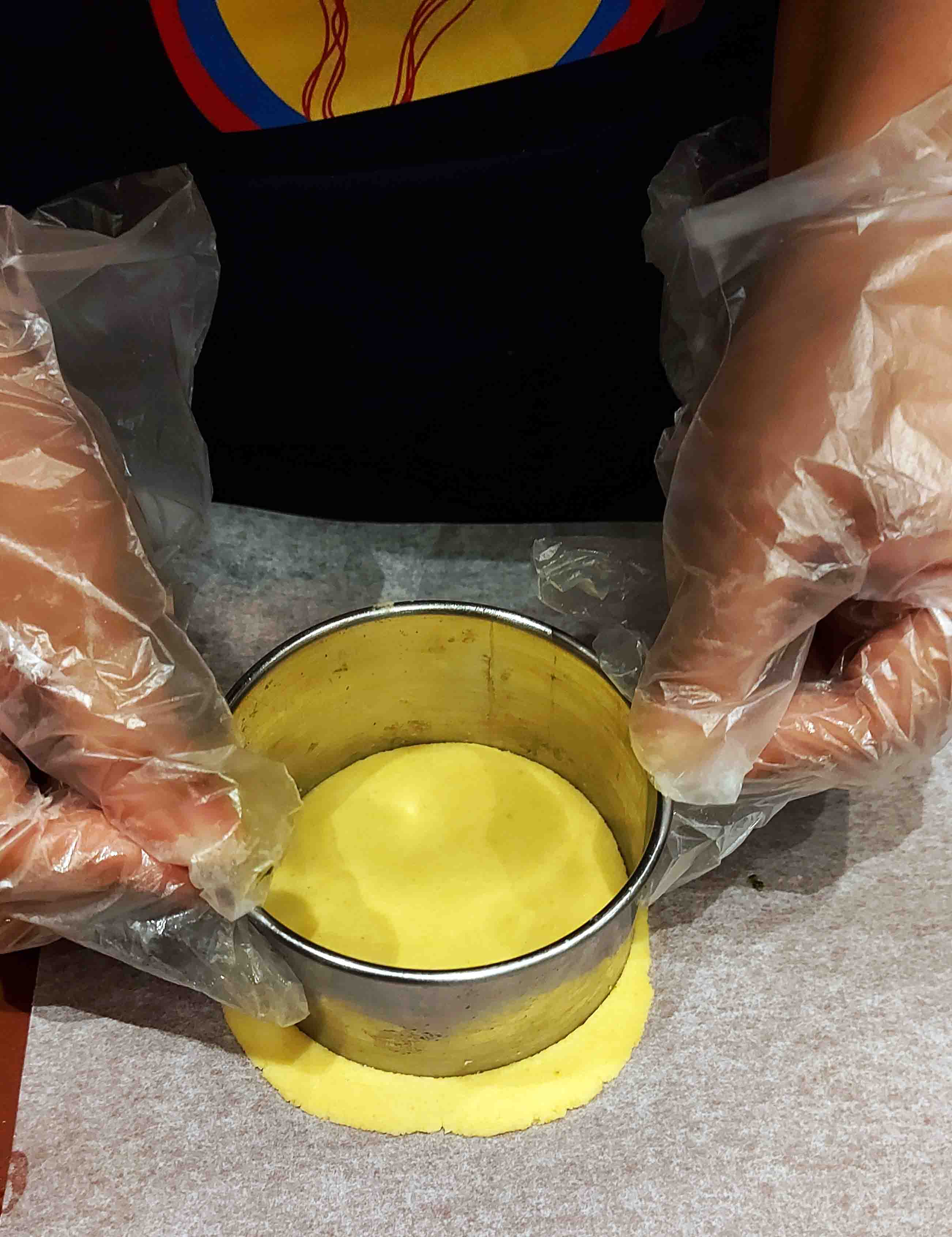En la mesa colindante, Nguyen Thuy Trang, vicedecana del Departamento de Español de la Universidad de Hanói, finalizó la extensión de la masa y comenzó a recortarla en forma redonda con un molde redondo de siete centímetros de diámetro. Trang compartió que se siente muy afortunada porque no todo el mundo tiene la oportunidad de recibir la instrucción meticulosa sobre cómo hacer un pastel que forma parte de la cultura colombiana en Hanói.