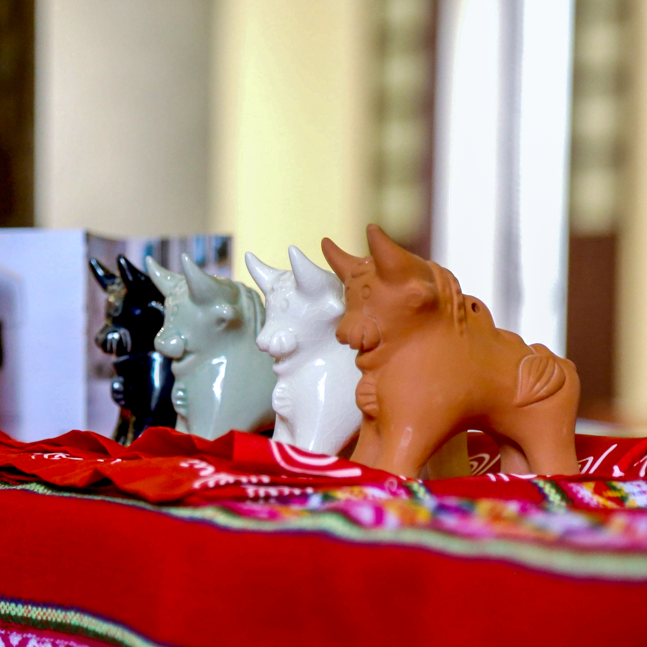 Las 4 piezas de toritos con diferentes colores y técnicas de esmaltes cerámicas disponibles en el taller. (Foto: Anh Thu) |