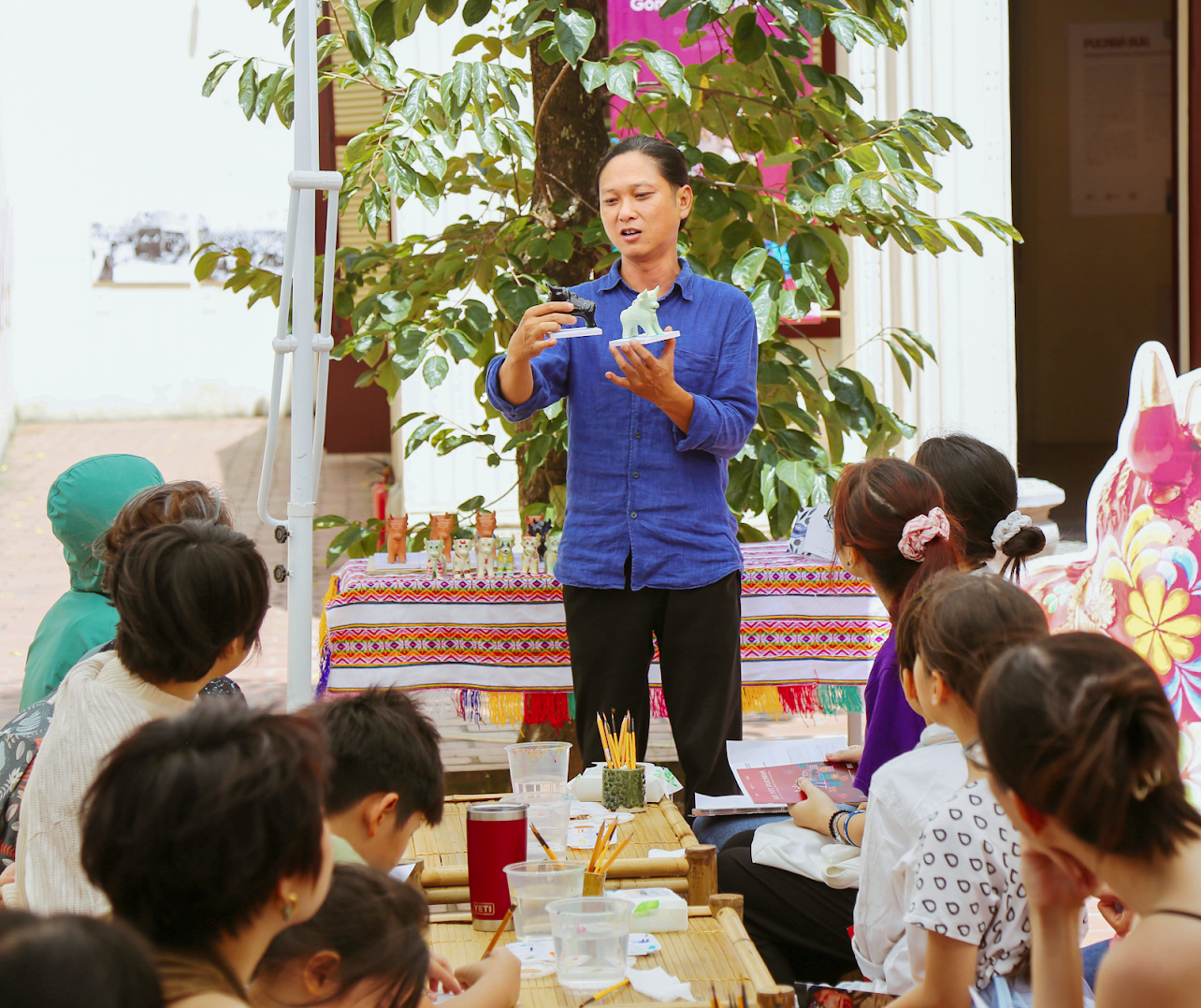El artista Trieu Minh Hai, representante de Puppets Studio explica a los participantes sobre 4 tipos de esmaltes tradicional vietnamita utilizados para producir las piezas ceramicas de toritos en el taller. (Foto: Anh Thu) |