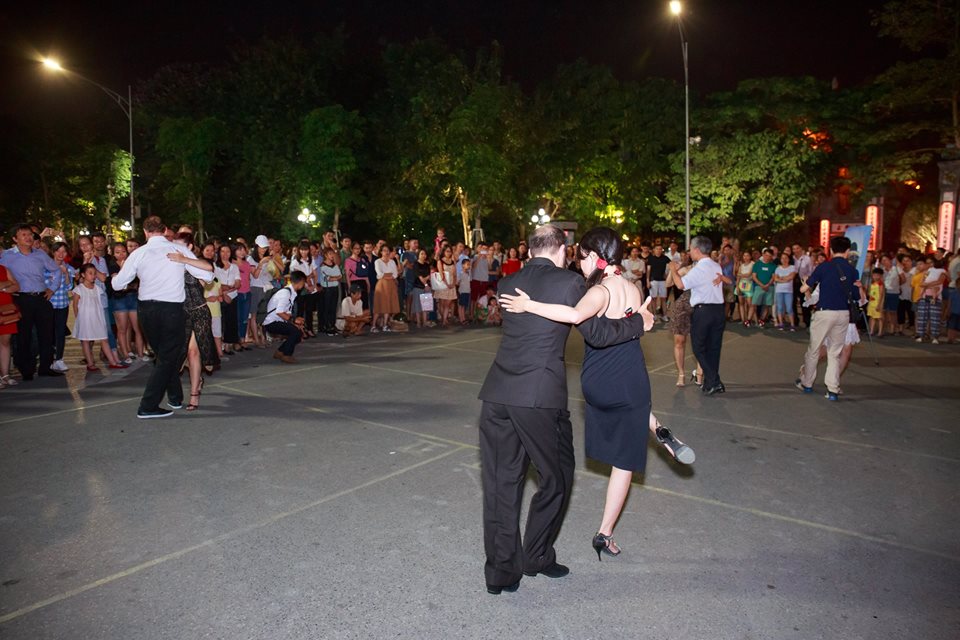 A las 19:30 horas, algo lejos se escucha la dulzura de la melodía clásica resonando desde amplificadores colocados en una bifurcación de las calles Hang Dau y Dinh Tien Hoang lo que atrae la atención de quienes caminan por la vía peatonal de Hoan Kiem, uno de los lugares más concurridos de la capital vietnamita. Cerca de la acera, la multitud rodea un par de tangueros bailando ávidamente. La artista Julieta Biscione lleva un atractivo vestido negro, el mismo color de la ropa de su colega Roberto Castillo. Se intercambian mutuamente miradas amorosas, mientras que sus piernas se mueven al ritmo de cada nota musical. A través de un lenguaje corporal y emociones personales, se refieren a una historia de amor bailando al ritmo de la canción Libertango.