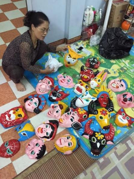 El taller de Nguyen Van Hoa y su esposa, Dang Thi Lan, ocupa el ático de su vivienda en la calle Hang Than, número 73. En estos días en vísperas del Tet, la pareja trabaja incansablemente para poder satisfacer los pedidos de su clientela. En un espacio de solo 30 metros cuadrados, cuyo suelo está lleno de boles de almidón, cartones y botellas de acuarela, la señora Lan nos contó que cuando era pequeña ayudó a sus padres en este trabajo y desde entonces se enamoró de las máscaras de cartulina. Al ampliar, agregó: