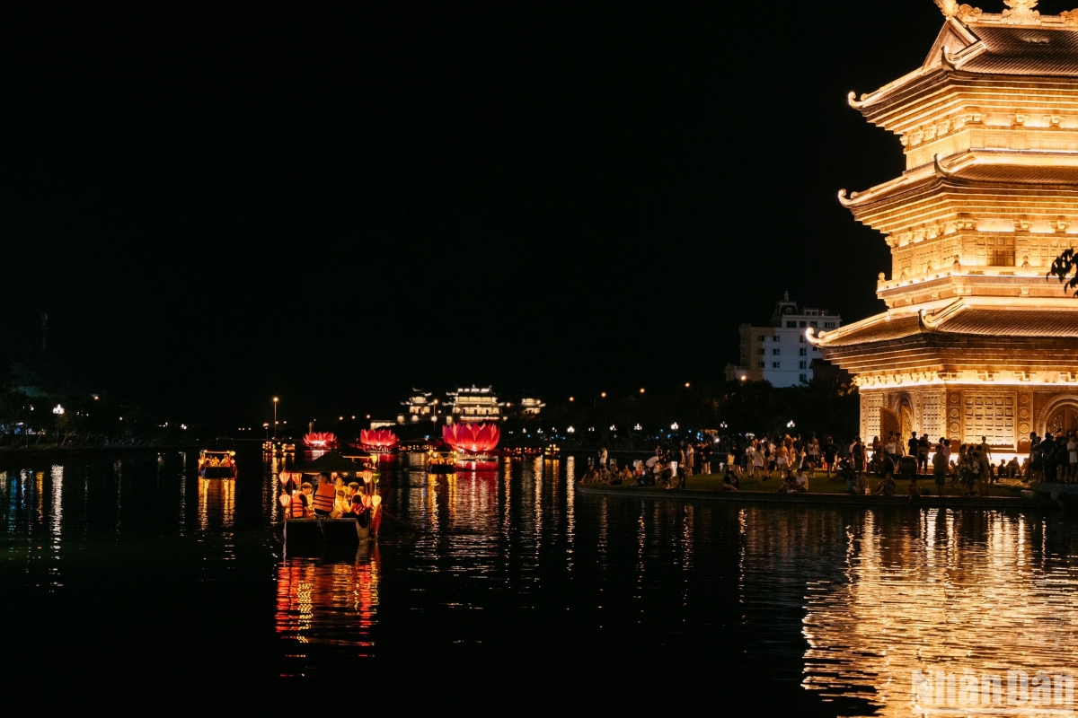 Visitantes disfrutan de un paseo en barco para admirar la deslumbrante belleza del casco antiguo de Hoa Lu por la noche. (Foto: nhandan.vn) |