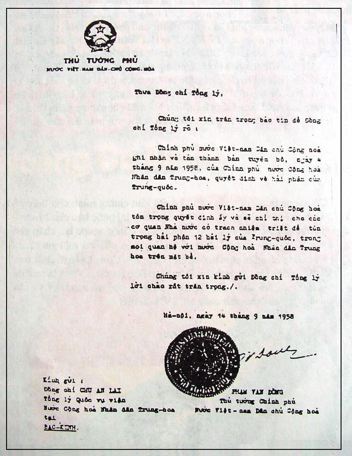 El 4 de septiembre de 1958, China declaró unilateralmente su soberanía marítima en el contexto en que la primera conferencia sobre el Derecho del Mar de la ONU no logró un consenso sobre la definición de la anchura de las aguas territoriales de la región. Como consecuencia, los países involucrados presentaron sus propias reclamaciones. Estados Unidos propuso 3 millas náuticas mientras otros estados sugirieron 4,5. Por su parte, China declaró 12 millas náuticas. El 14 de septiembre de 1958, el entonces primer ministro de la República Democrática Popular de Vietnam, Pham Van Dong envió una misiva a su homólogo chino, Zhou Enlai en la que afirmó: “El Gobierno de la República Democrática Popular de Vietnam reconoce y apoya la declaración del Gobierno de la República Popular de China emitida el 4 de septiembre de 1958 que define las aguas de China”…