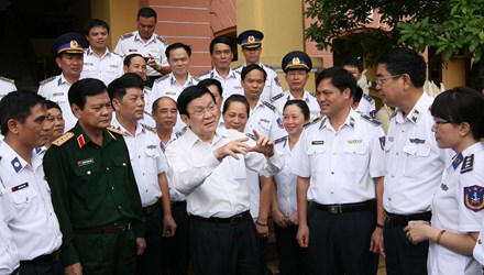 El presidente Truong Tan Sang intercambia con efectivos de la Policía marítima