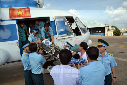 ![]() Médicos militares trasladan pacientes desde la isla de Song Tu Tay hasta el distrito insular de Truong Sa, provincia central de Khanh Hoa en agosto de 2016