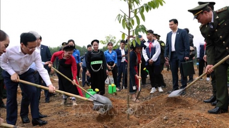 (VOVWORLD) - En la mañana de este 15 de febrero, o el 6 de enero en el calendario lunar, en la comuna de Kim Phu, ciudad de Tuyen Quang, el presidente Vo Van Thuong asistió al lanzamiento de la Fiesta de Siembra de Árboles.