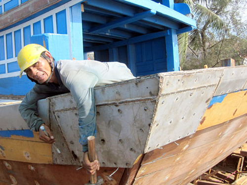 ![]() Trabajador de la cooperativa de construcción y reparación de barcos Co Luy refuerza una embarcación de madera con casco de acero