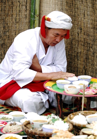 ![]() Un hombre Cham prepara las ofrendas y reza por un año nuevo con buena fortuna y abundante cosecha