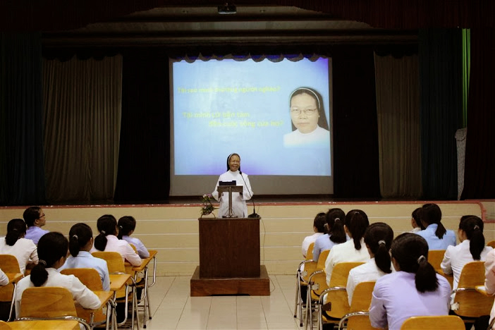 La monja Tran Thi Kim Huong presenta a estudiantes locales
