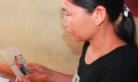 La viuda Nguyen Thi Hue está viendo una foto que tomó junto a su marido