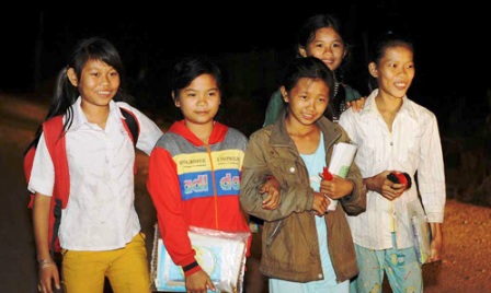 ![]() Cuando cae la noche, los alumnos llegan a la clase de alfabetización de los combatientes del puesto fronterizo Ia Rve