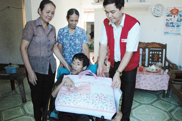 Un representante de la Cruz Roja vietnamita visita y entrega obsequios a una víctima del agente naranja