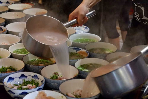 Una vez que los clientes realizan su pedido, los chefs introducen la harina de arroz en la máquina de hacer fideos. Los fideos salen de ésta y caen en una olla de agua hirviendo ubicada debajo de la máquina. Cuando están bien cocidos, se dividen en pequeñas porciones y se reparten entre los cuencos. De la máquina salen fideos suficientes para alimentar a 20 comensales. Después, los cocineros echan pasteles de camarones y pescado, calamares y cilantro cortado fino en el cuenco de los fideos. Por último, vierten el caldo.