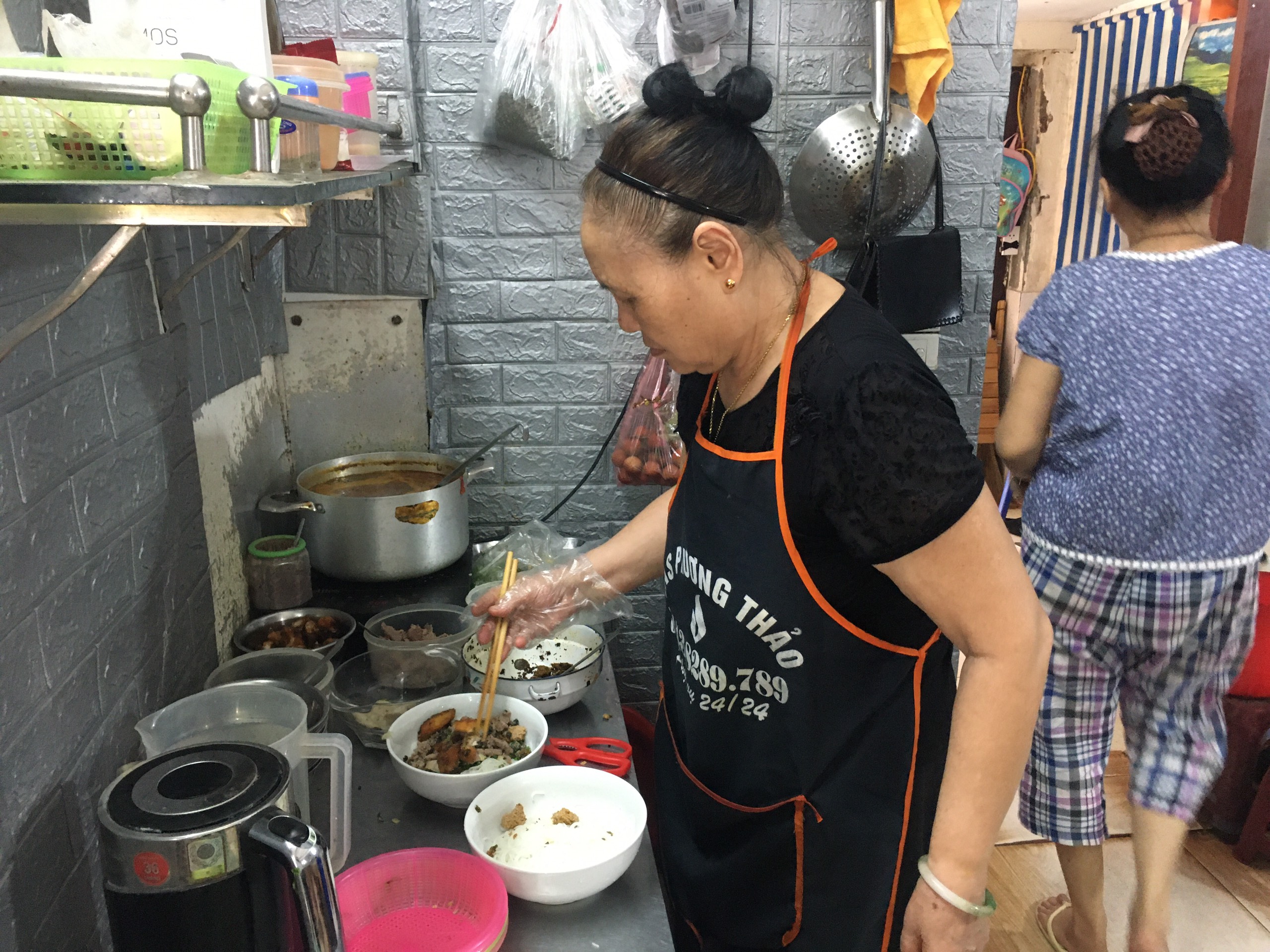 Entramos al mediodía al restaurante Ba Mam, en el número 28 de la calle de Hang Voi, en el distrito de Hoan Kiem, Hanói. Es uno de los locales más famosos de su tipo en esta capital. Pese a su avanzada edad, su dueña, la señora Mam, se levanta todos los días a las 4 de la madrugada para preparar el caldo y los ingredientes del bun rieu cua que vende de las 7 de la mañana a las 4 de la tarde. Mientras echa fideos de arroz en unos tazones, ella nos dice: “Antes, un tazón de bun rieu cua era muy sencillo, ya que sus ingredientes solo consistían en unos cuatro tomates, caldo de cangrejo y una cucharada de la pulpa obtenida de este. Ahora, para satisfacer los diversos gustos de los clientes, hay que añadirle lonjas de carne de res, trozos de salchicha vietnamita, tofu frito o caracoles de agua dulce, o todos a la vez. También debemos sazonar el caldo con las cantidades de glutamato o salsa de camarón que le apetezca a cada comensal”.