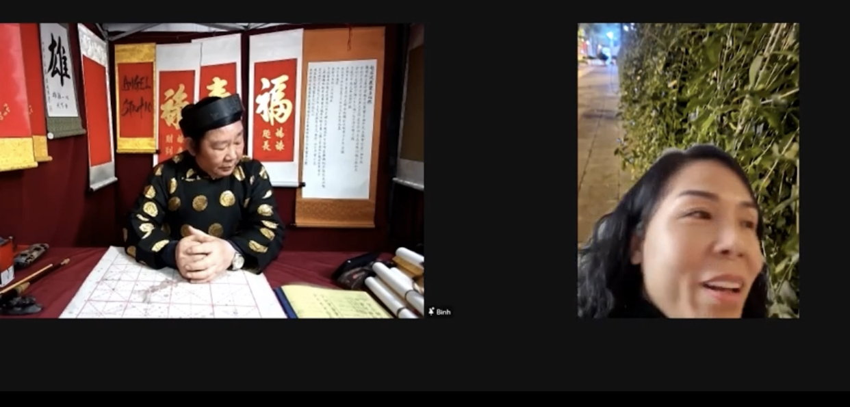 Los clientes conversan con maestros de caligrafía a través de la plataforma Zoom. (Foto: duxuanonline.com.vn) |